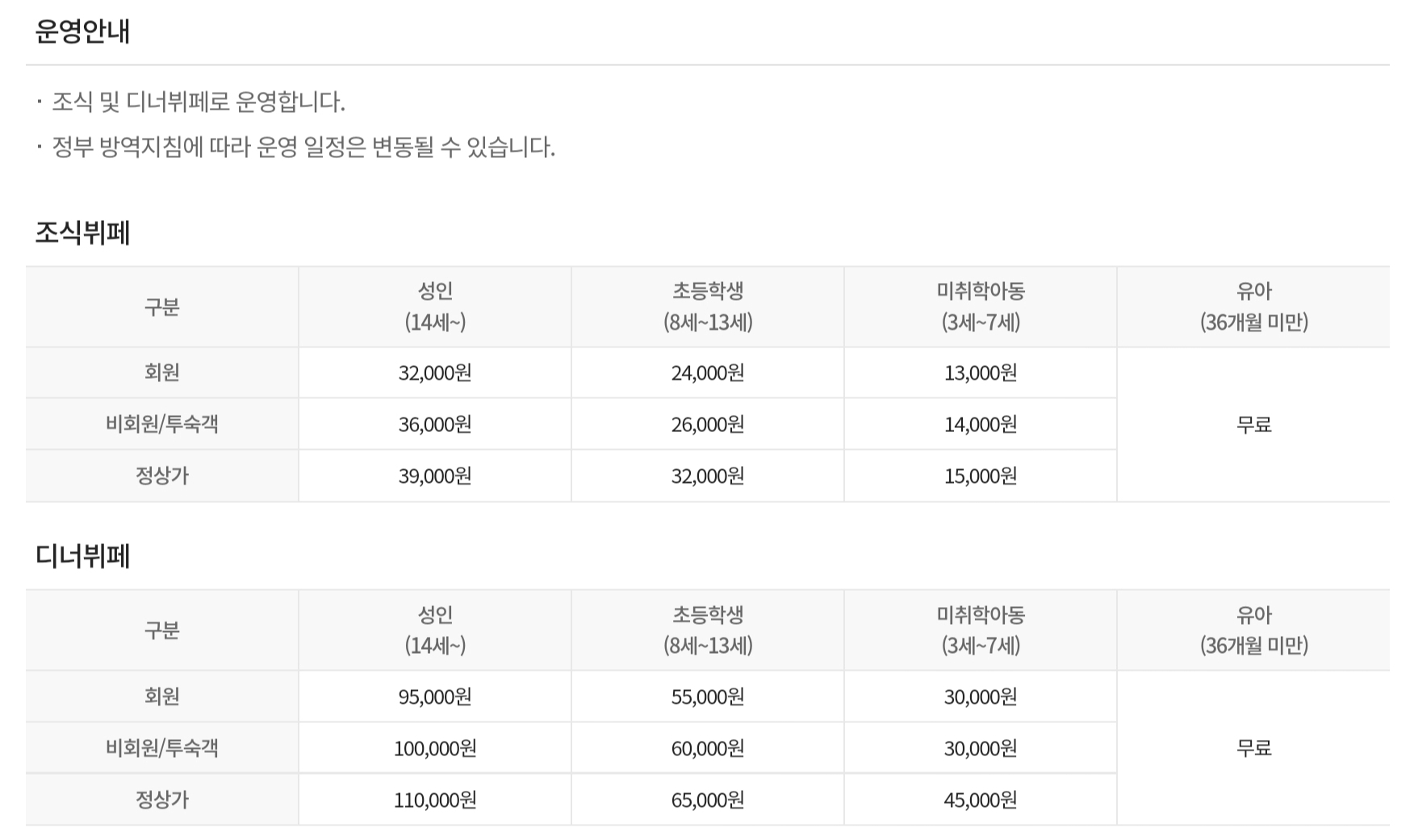 조식과 디너 이용요금은 회원, 투숙객, 정상가로 나누어져 있으니